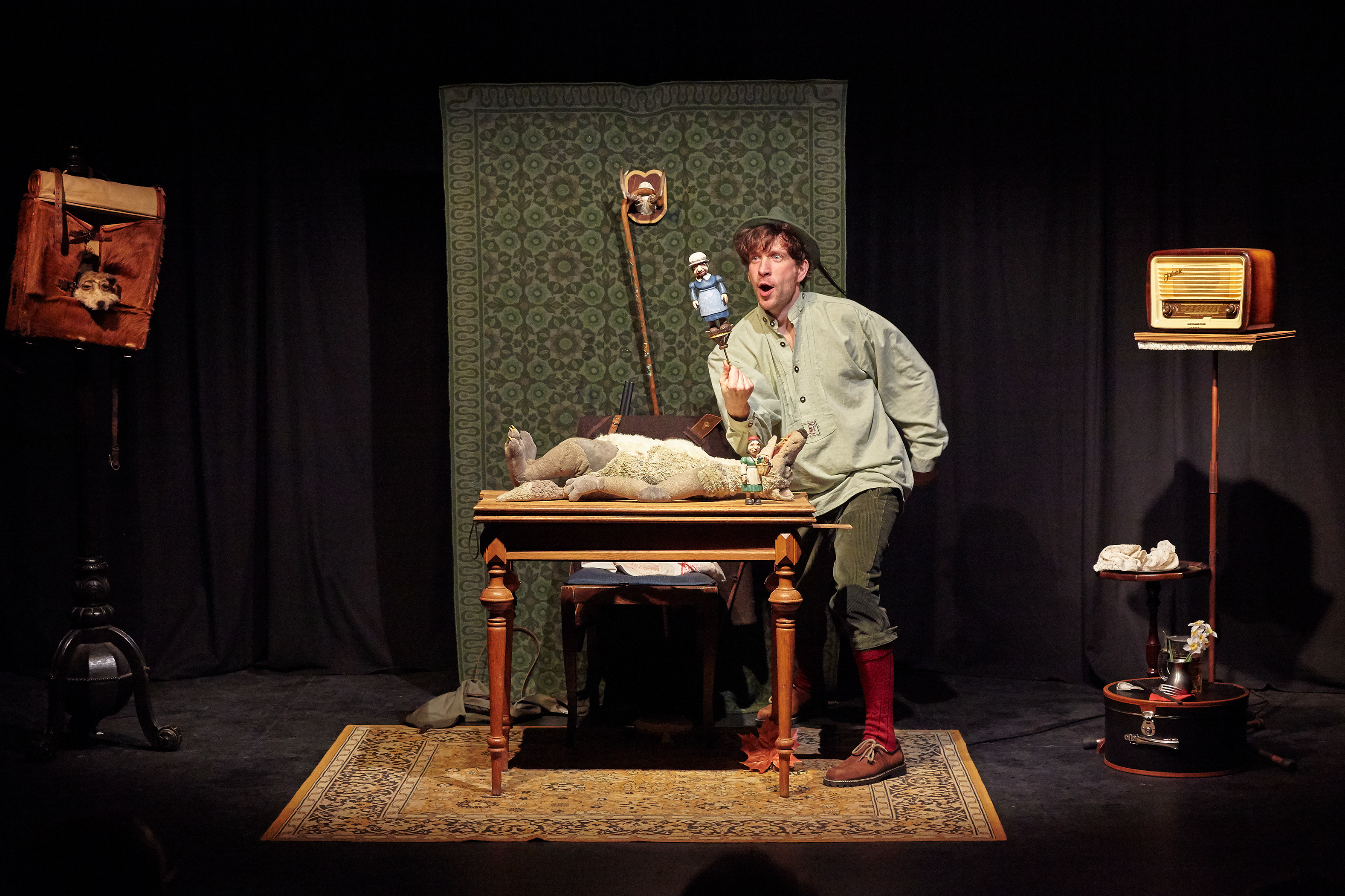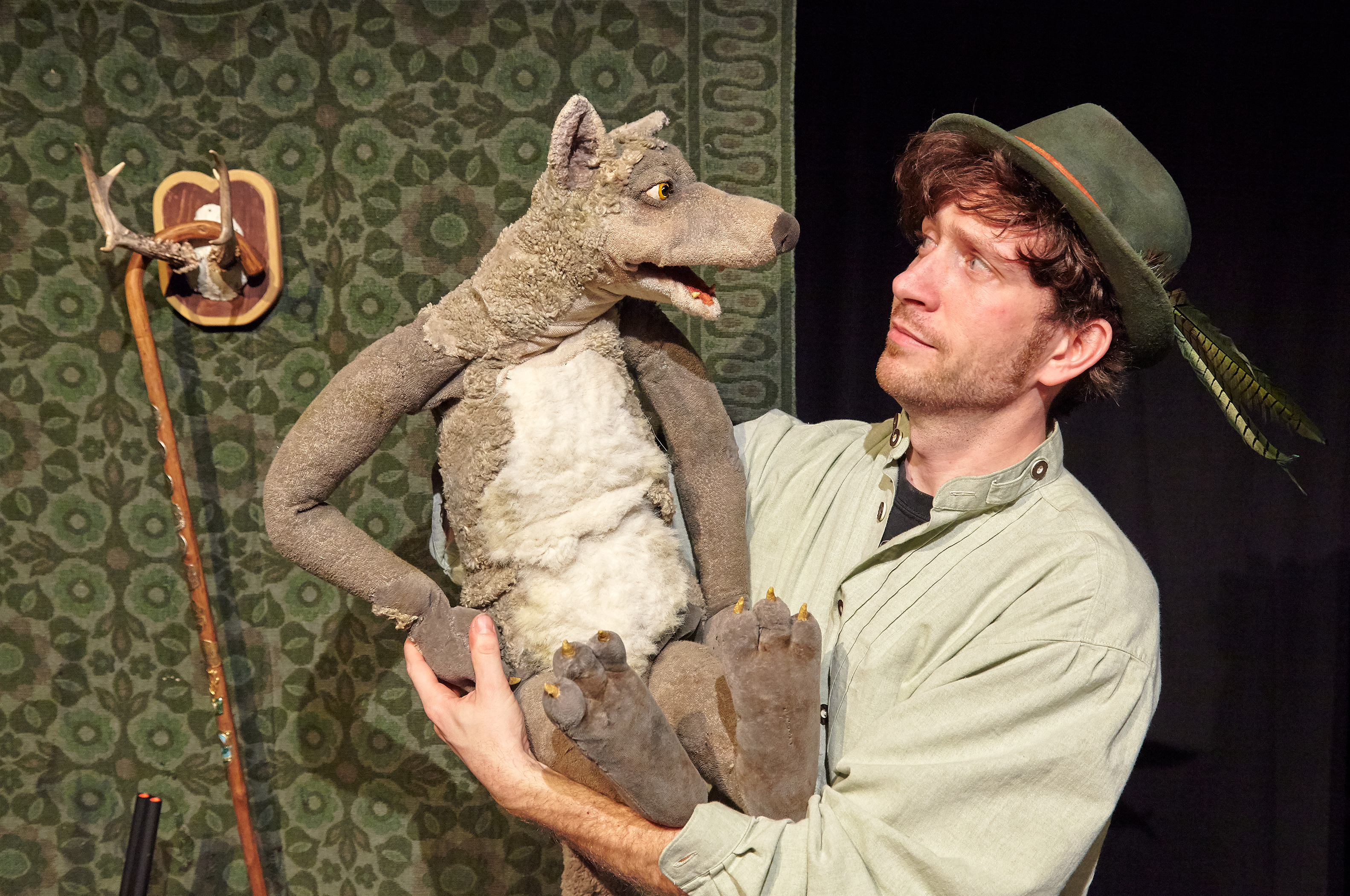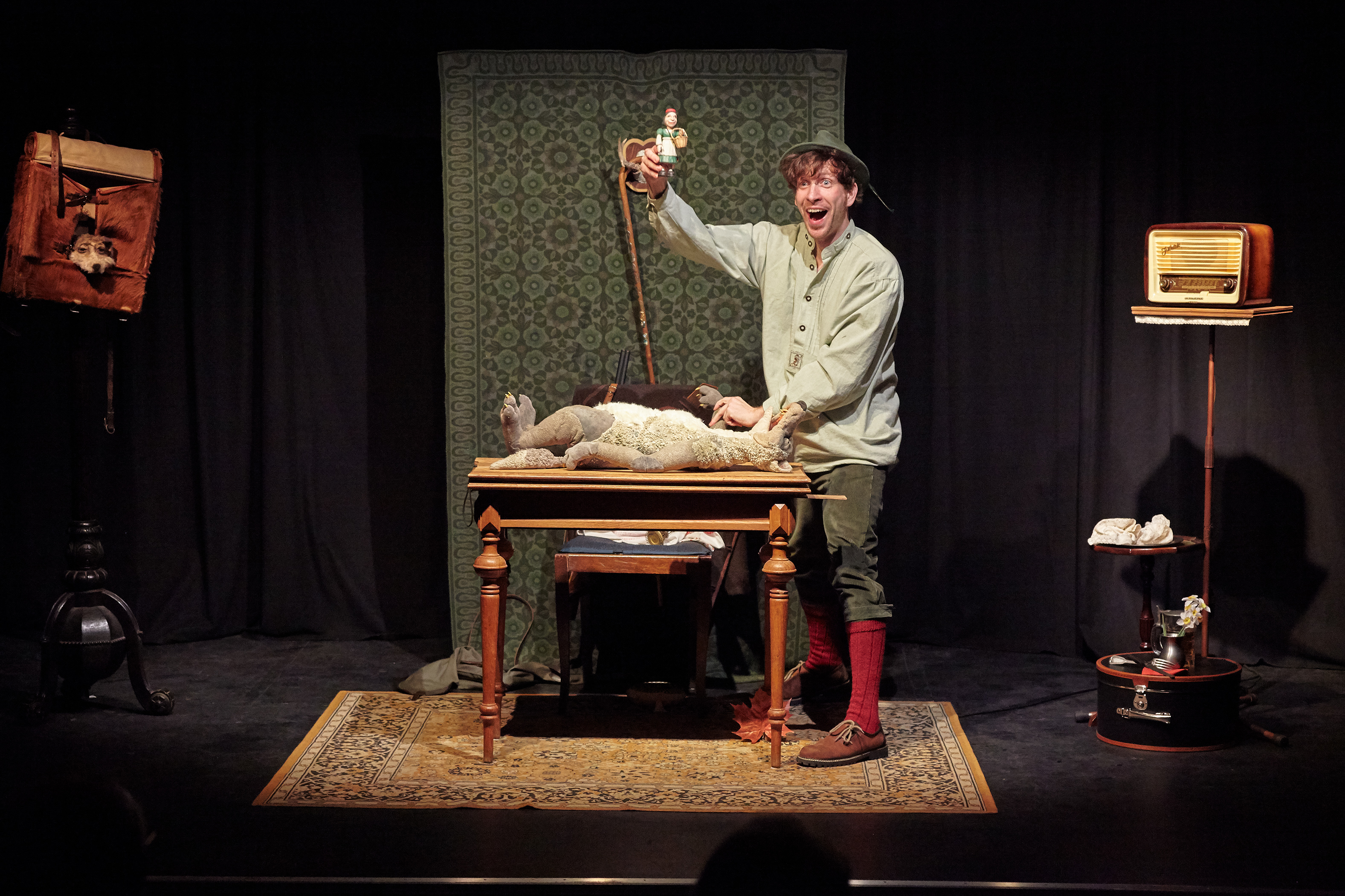 Daniel Wagner spielt den Jäger, der diese unglaubliche Geschichte von einem Mädchen mit einer roten Kappe erzählt.